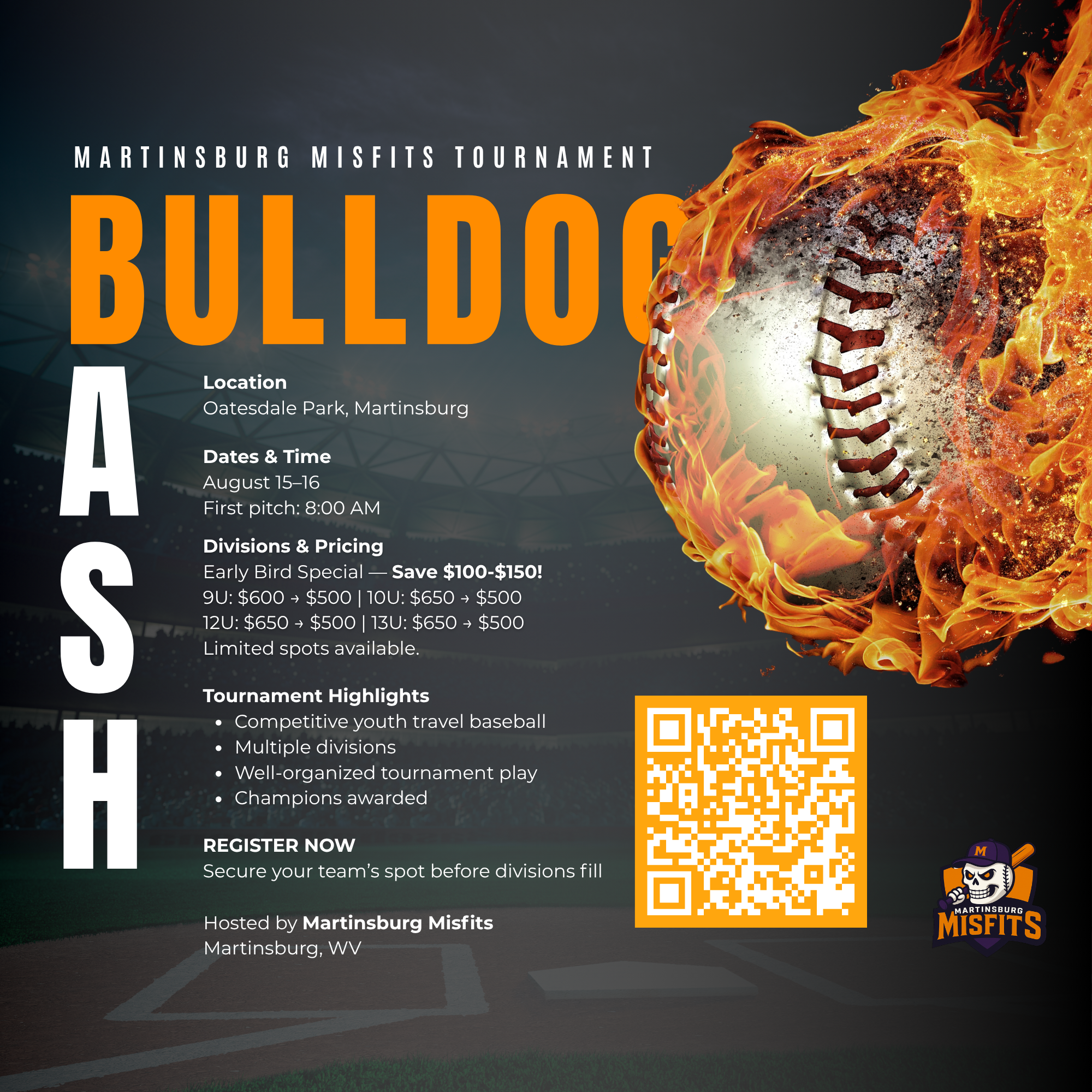 The Bulldog Bash is coming to Martinsburg, West Virginia for an exciting weekend of competitive youth travel baseball. Hosted by the Martinsburg Misfits, this tournament brings together top teams for well-organized play, great competition, and a first-class tournament experience.